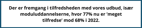 Vi kan dog se, at der er et lille fald i tilfredsheden med kvaliteten og udbyttet af uddannelserne siden 2022. Andelen af ’meget tilfredse’ er gået fra 88% til 80%. Omvendt er der fremgang i tilfredsheden med vores udbud, især moduluddannelserne, hvor 77% nu er ’meget tilfredse’ mod 68% i 2022.