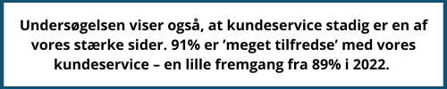 Undersøgelsen viser også, at kundeservice stadig er en af vores stærke sider. 91% er ’meget tilfredse’ med vores kundeservice – en lille fremgang fra 89% i 2022. Derimod er tilfredsheden med vores kundechefer faldet fra 98% til 90%, men det er stadig meget højt. Det ser vi som en opfordring til at fortsætte med at den høje service og sikre den bedst mulige sparring.